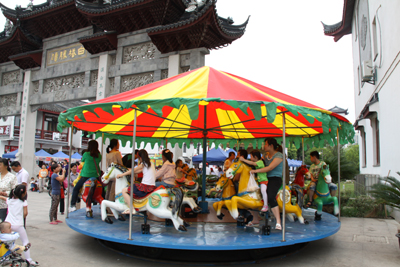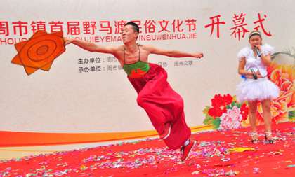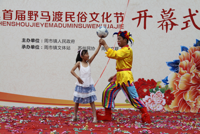 在昆山市周市镇“首届‘野马渡’民俗文化节”开幕式上,既有周市本地的传统舞狮表演,又有著名的四川变脸、东北二人转、杂技魔术等具有民族传统特色的文艺演出。活动现场,不仅安排了来自江南名城苏州的民间文艺家传统手工技艺绝活现场展示、民间文艺表演、原生态民俗美食实景演绎,而且针对儿童节安排了孩子们喜欢的旋转木马、水车等民间游艺项目,还有独具特色的地方特色传统美食,更有为民免费普查眼睛的公益活动。